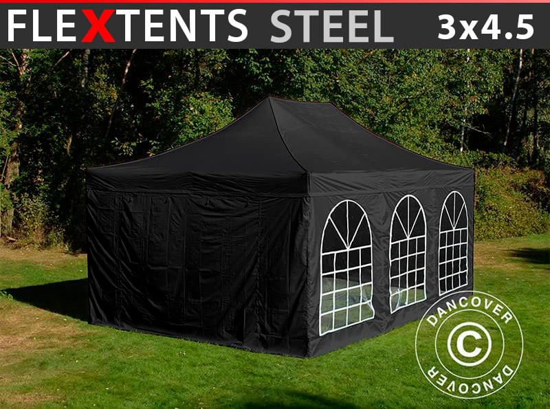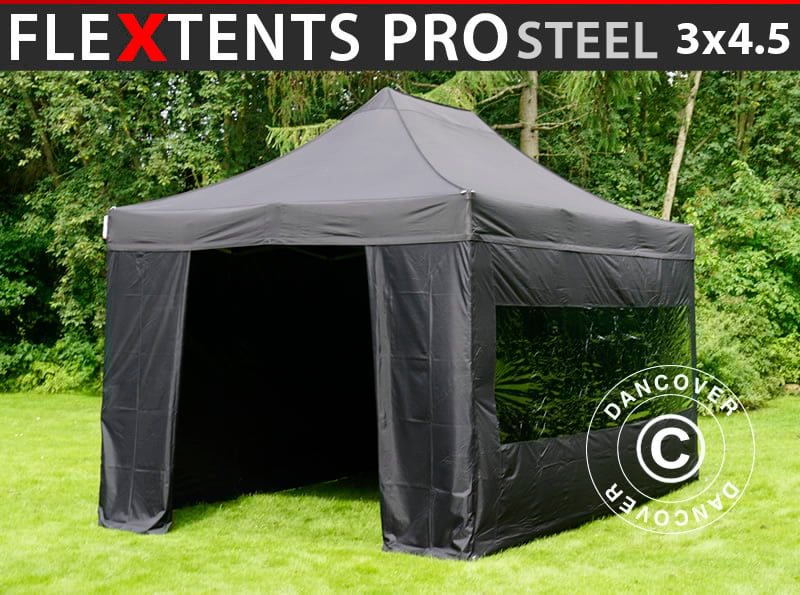 Snabbtält Depåtält Easy-up tält Eventtält Partytält FleXtents PRO Steel 3x4,5m, Svart, inkl. 4 sidor