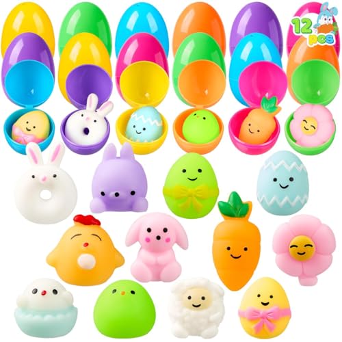 JOYIN 12 förfyllda påskägg fyllda med 12 mochi-quishy-leksaker för barn, påskägg att fylla för påsk, partytillbehör, för påsktema, fest, jagning, påskkorgar