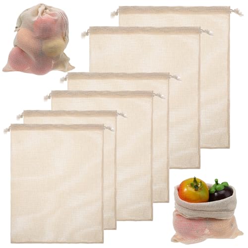 TIESOME 6 stycken fruktnät, inköpsnät, återanvändbar nätficka med dragsko, grönsakspåse för förvaring av frukt och grönsaker, tvättbar, beige (3 storlekar), Beige, Förvaringsprodukter påsar