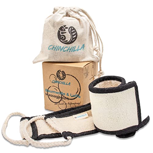 Chinchilla® Massagebälte luffasvamp och bomull | Ryggskrubborste i litet format för kroppsskrubb och mild ryggmassage | kroppsborste för dusch och wellness | inklusive påse för förvaring