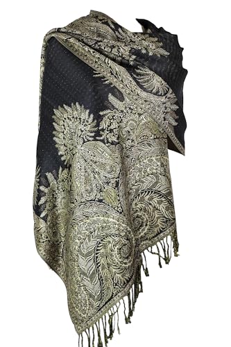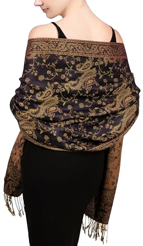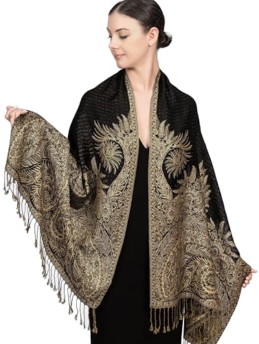 Plommonfjädrar Pashmina-halsduk med etnisk gobeläng stil paisleymönster – 170 cm x 71 cm vardaglig pashmina resesjal och sjal, Svart multi gobeläng, one size