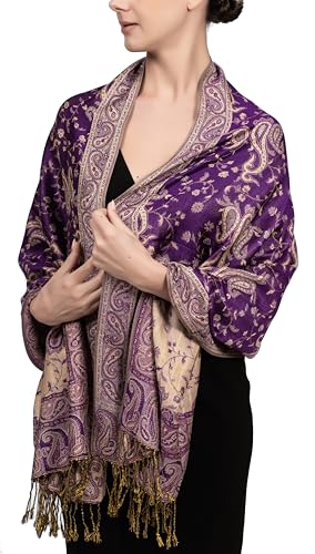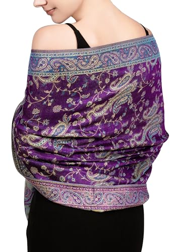 Achillea Soft Silky Reversible Paisley Pashmina Shawl Wrap Scarf w/Fringes (Purple Turquoise)