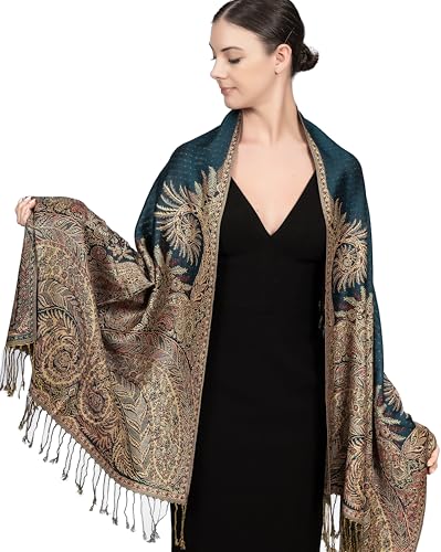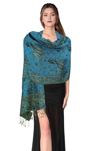 Achillea Soft Silky Reversible Paisley Pashmina Shawl Wrap Scarf w/Fringes (Teal)
