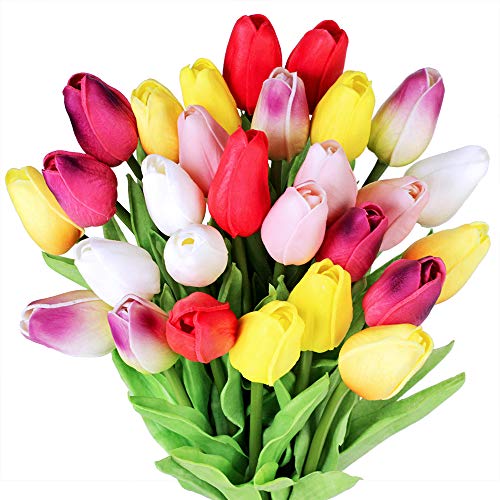 28 st flerfärgade tulpaner konstgjorda blommor falska tulpanstjälkar äkta känsla PU tulpaner för påsk vårkrans bröllopsbukett mittpunkt blomsterarrangemang kyrkogårdsbord dekor 35,56 cm lång