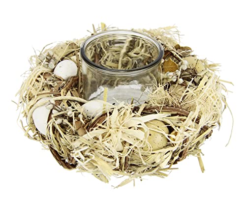 Lykta av naturmaterial med ägg, fjädrar och glasinsats, dekorativ krans med blommor, värmeljushållare, dekorativ krans, ljushållare, vårkrans, värmeljuskrans, bordsdekoration, vår, påsk