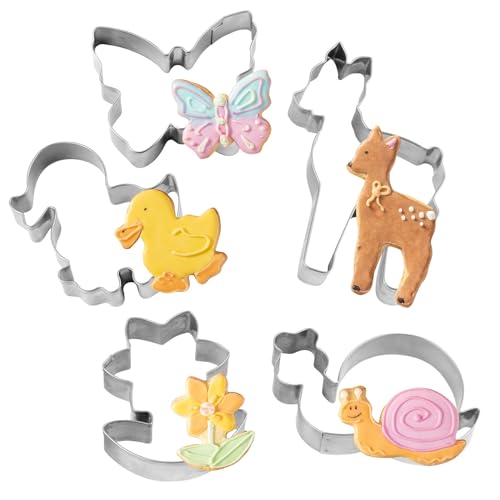 Dr. Oetker kakskärare skogsmagi – 5-delat set i rostfritt stål för påsk, motiv: snigel, rådjur, anka, fjäril och blomma, diskmaskinssäker, silver