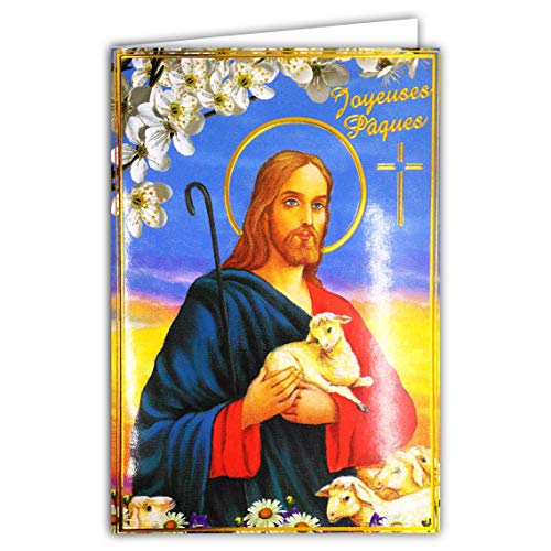 Afie 62-1010-B glad guldfärgad PÅSK kort och vitt kuvert - Katolsk religion kors Jesus Kristus god herdeshepherd lamm får flock blommor fest