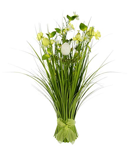 Gräsbuss med blommor, blommor, ägg och slingor, konstgräs kanter, grässtenar, dekorgräs, prydnadsgräs, gräslås, gräslåsor, gräsarrangemang, gräsmatta, skyltar, påsk, dekoration
