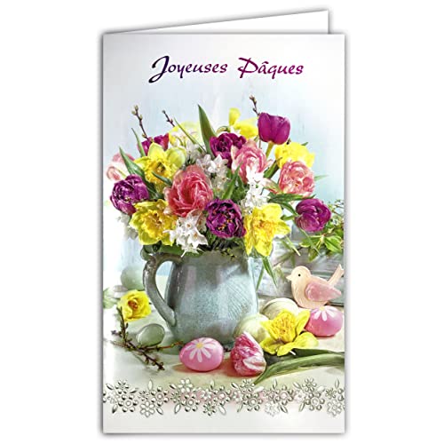 Karta glad påsk buketter blommor vår påsklilja Narciss Muscaris målade ägg hjärta levereras med kuvert format 12 x 19,5 cm FSC-miljömärke papper hållbar förvaltning skog tillverkad i Europa 12-688