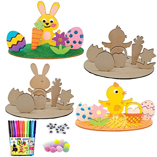 Påskpyssel för barn, 4 stycken gör-det-själv påskhare-dekoration, kaniner av trä för målning, påskpyssel trä med färgglada minipoms, kullerögon, 12 färgpennor för påsk pysseltillbehör dekorationer