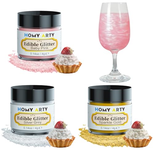 HOMY ARTY Ätbart glitterset, 3 färger smaklöst ätbart glitterpulver, ätbart glitter för tårta/ätbara glitterdrinkar till påsk, jul, oktoberfest, champagne, cocktails. 4g/burk