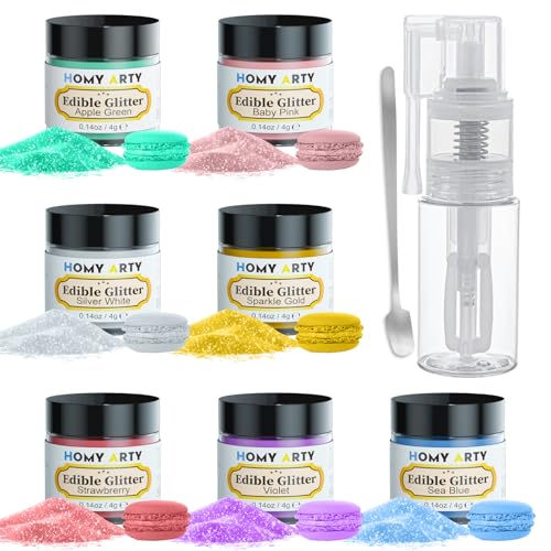 HOMY ARTY Ätbart glitterset, 7 färger smaklöst ätbart glitterpulver, ätbart glitter för tårta/ätbara glitterdrinkar till påsk, jul, oktoberfest, champagne, cocktails. 4g/burk