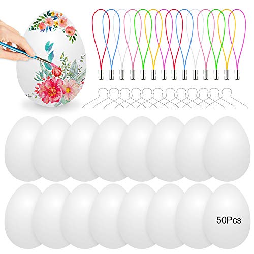 Påskägg dekoration, plast, vit, 50 st, plastägg, 6 cm, dekorativa ägg, plastägg för pyssel, dekoration, påsk, plast, påskägg med hängare för hantverk, målning, hängande