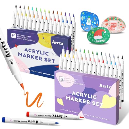 Arrtx Akrylfärgpennor, 58 färger, för stenmålning, extra penselspets, vattenbaserade färgpennor för sten, glas, påskägg, trä och tygmålning, gift- och luktfria, typ 30A+B