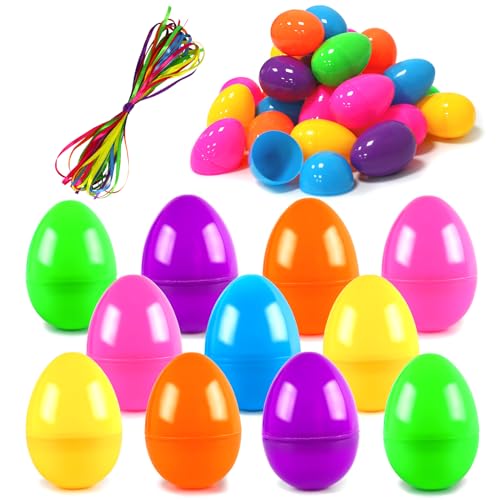 ROSAUI 36x Påskägg Plast Färgade – 6 cm Diameter, 8,7 cm Höjd, Fyllbara Påskägg för Godis och Små Presenter med 6 Stycken 2,4m Långa Färgglada Band