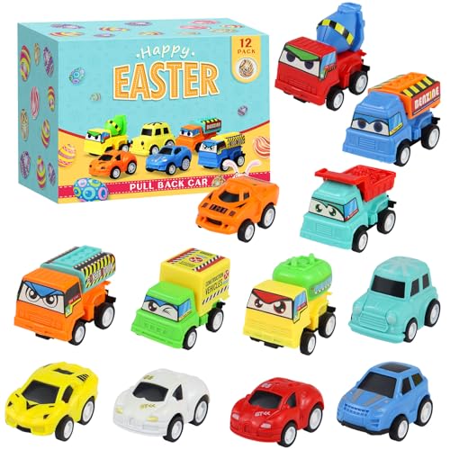 Bilfest present barnfödelsedag, 12 stycken fyllda påskägg med leksaksbilar stadsbilar och lastbilar, fest små presenter ge bort påskkorg fyllning påskpresent för barn pojkar