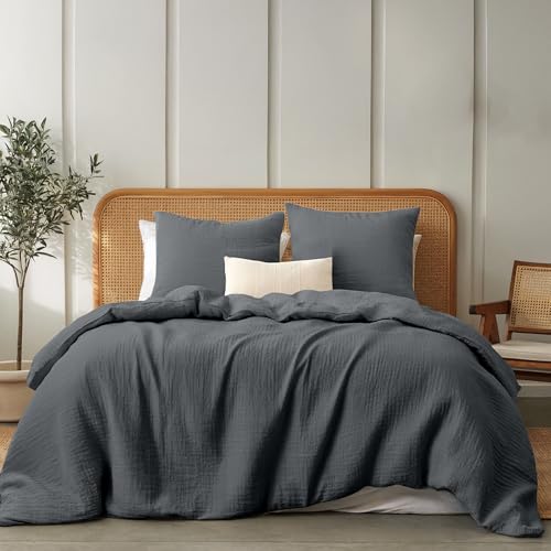 Dreamzie - Påslakan i bomullsgaze 200x200 cm, mörkgrå, med 2 örngott 80x80 cm, Sängset 200x200 Mjuk och ventilerande bomull - Oeko-Tex Certified Sänglinne
