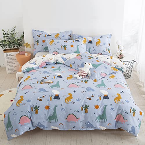 DJY Dinosaurie påslakanset drottning, 100% bomull blå vit vändbart barnbäddset för pojkar flickor, 3 delar ultramjukt andningsbart täcke set (1 påslakan + 2 örngott)