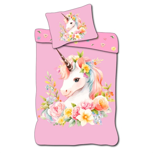 Enhörning påslakan 140x200 cm - Vändbart påslakanset med fin enhörning och vackra blommor - 100% mjukt bomullspåslakan