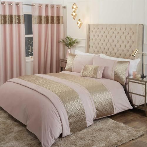 Rapport Home Lyxig påslakanset i rosa sammet – Super King Size-sängkläder med guldpanel, diamantutsmyckning och geometrisk design, mjuk och elegant sovrumsinredning