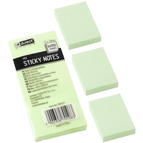 D.RECT Självhäftande lappar 51 x 38 mm Sticky Notes självhäftande anteckningsblock för kontor hus 300 ark 3 st x 100 cellet pastellfärg