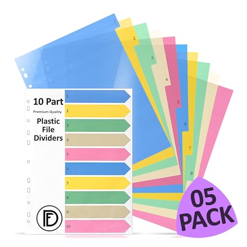 DocFeedz [05 pack] Fildelare i plast 10 delar A4 med indexpapper, pastellfärg, mappavdelare, A4 med förstansade hål – ringpärmdelare för hem, skola och professionell användning
