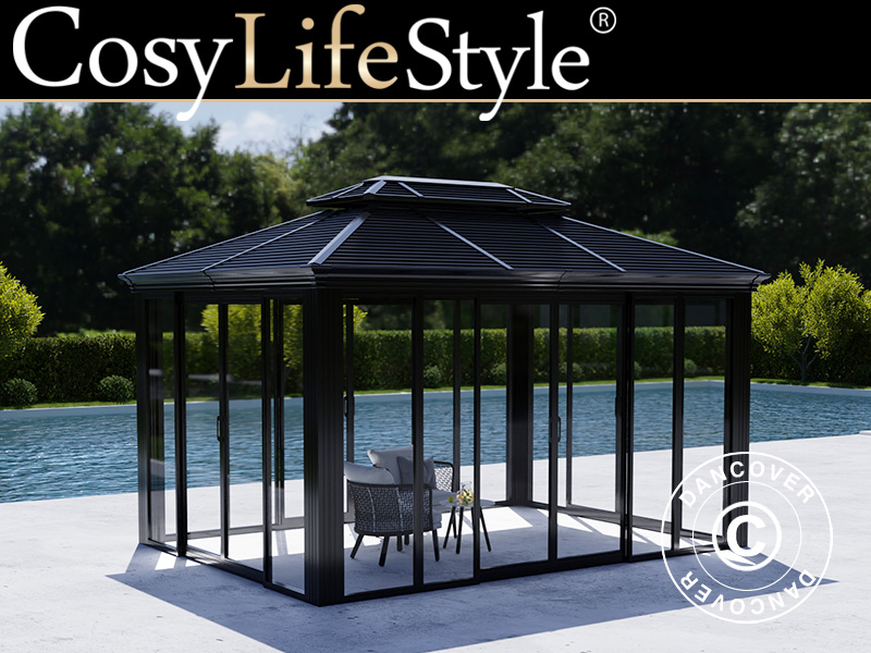 Paviljong Trädgårdspaviljong Santa Fe med sidoväggar och skjutdörrar, 3x4,25m, Svart