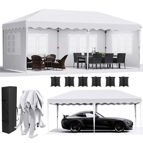 Hopfällbar 3 x 6-paviljong med 4 sidodelar, vattentätt festtält i tjockt 420D-Oxfordtyg, trädgårdspaviljong med 50+ UV-skydd, trädgårdstält inkl. bärväska, paviljong för trädgårdsfest och bröllop, vit