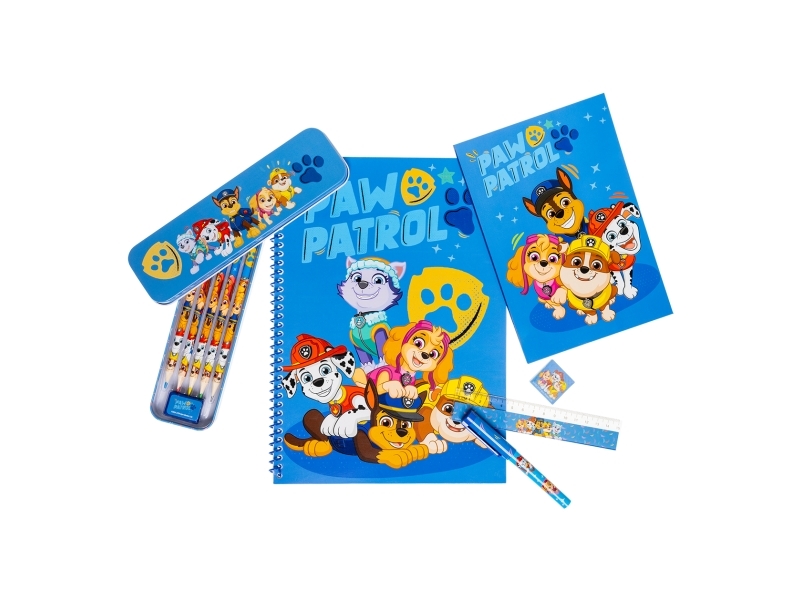 Paw Patrol Bumper Set Innehåll: Plåtpennfodral Med 4 Färgpennor +1 Hb-Penna, Pennvässare, Wire-O Anteckningsbok A4 & Anteckningsbok A5, Kulspetspenna, Linjal 15 Cm, Suddgummi.