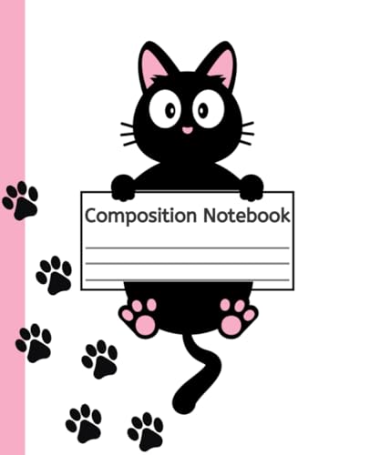 Cute Black Cat Composition Notebook – Pink Spine, Paw Print Design, and Adorable Cat Interior | Cute School Notebook for Kids, Teens, and Cat Lovers