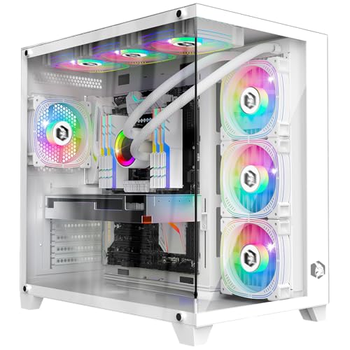 PCZZOI PC-fodral ATX 9 PWM ARGB-fläktar förinstallerade, Mid-Tower Gaming PC-fodral, 270° panorama härdat glas datorfodral med typ-C, 360 mm kylarstöd, vit