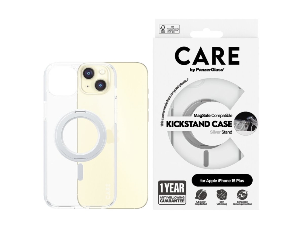 Care By Panzerglass - Baksidesskydd För Mobiltelefon - Med Fällbart Ställ - Magsafe-Kompatibilitet - Termoplastisk Polyuretan (Tpu), Polykarbonat (Pc) - Silver, Transparent - För Apple Iphone 15 Plus