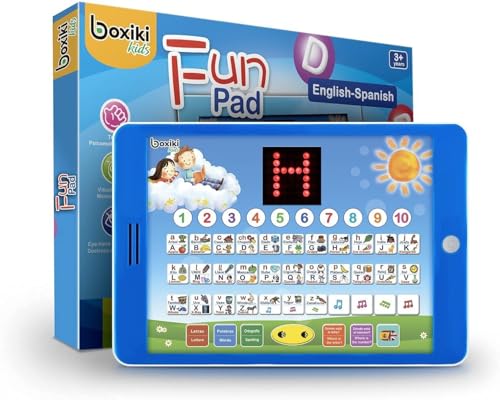 Boxiki spansk-engelsk surfplatta tvåspråkig pedagogisk leksak med LCD-skärm touch-and-teach pad för barn som lär sig spanska och engelska. ABC-spel, stavning, "Var är?" Spel, roliga melodier