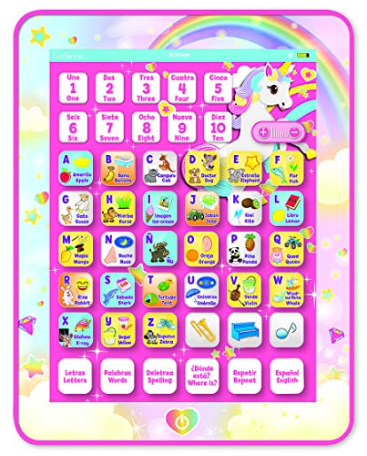 LEXIBOOK Unicorn Pedagogisk tvåspråkig interaktiv inlärningsbricka, leksak för att lära sig alfabetsbokstäver, siffror, ord och musik, engelska/spanska språk, rosa, JCPAD002UNIi2