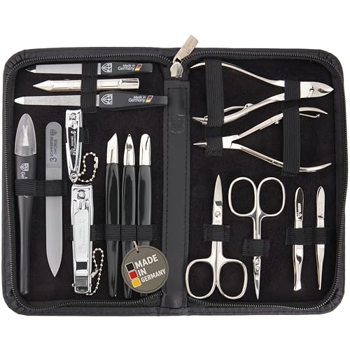 Cinisello - Tre svärdenheter 16 st. Manikyr-pedikyrset | högkvalitativt nagelfodral av äkta läder. Färg: Svart | Innehåll: Nagelsax, nagelklippare, pincett.