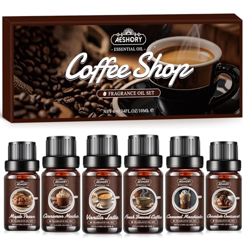 AESHORY Kaffe Eteriska Oljor Set 6 x 10ML, Aromaterapi Oljor Doftoljor Gift Set för Diffusorer - Färskmalet Kaffe, Vaniljlatte, Karamell Macchiato, Kanelmocha, Lönn-pekannöt, Chokladcroissant