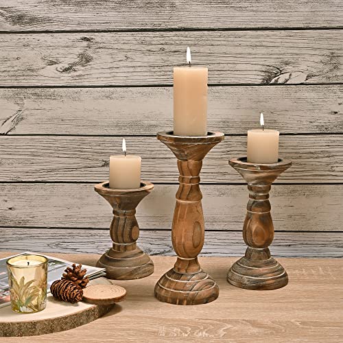 Yorkmills Ljushållare för pelare, uppsättning av 3, bondgårdsdekor, vardagsrum, höga ljushållare för pelarljus, ljushållare i trä för bordsuppsatser, brun heminredning, kök, matsal, bordsdekor