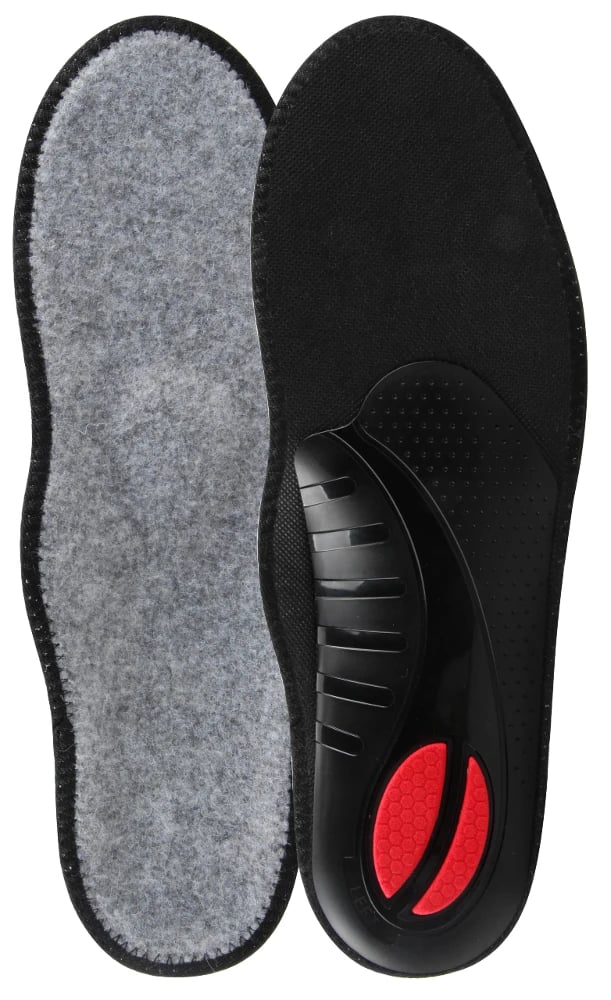 Värmande sula med stöd för fotvalv och inbyggd pelott