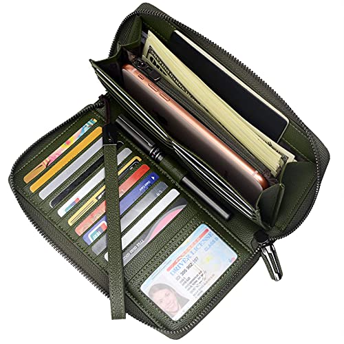 RFID-blockerande plånböcker för kvinnor äkta läder dragkedja runt stor resa mobiltelefon damer långa pengar plånböcker plånbok, 18 kortplatser (olivgrön)