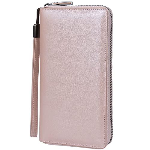 Rfid blockerande plånböcker för kvinnor äkta läder dragkedja runt stora resor mobiltelefon damer långa pengar plånböcker plånbok, 17 kortplatser (roséguld)