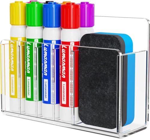 Lumanman Akryl torr raderbar markörhållare med justerbara fack, magnetisk markörorganisatör för fili, skåp, whiteboard, självhäftande pennhållare för vägg, klar