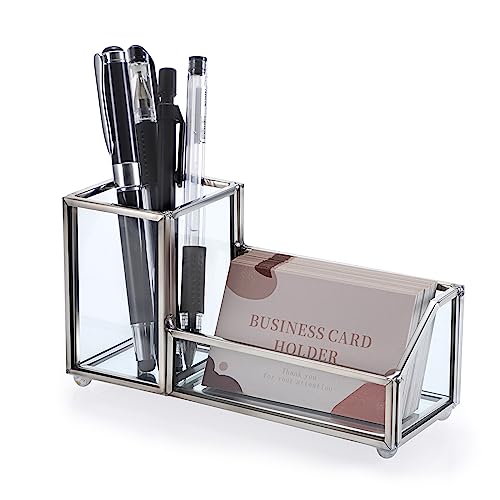 Hipiwe Visitkortshållare i glas metall pennhållare för skrivbord klar visitkortsvisning organiseringsfodral för kontor hem, 2 fack, silver
