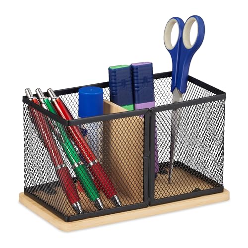 Relaxdays pennhållare, bambu & nät, H x B x D: 11 x 19 x 10 cm, pennkopp för skrivbord, pennhållare, svart/natur