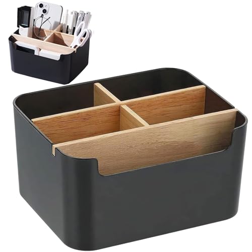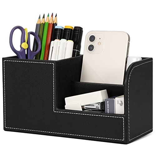 GORESE Trästruktur, PU-läder, multifunktionell, skrivbordsförvaring, pennhållare, skrivbord, multifunktionell kontorsorganisatör (svart)