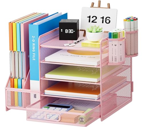 Marbrasse Skrivbordsorganisatör med filhållare,5 nivåer brevfack papper med låda och 2 pennhållare,skrivbord nät,förvaringsfack,organisatör för kontorsbehov (Rosa)
