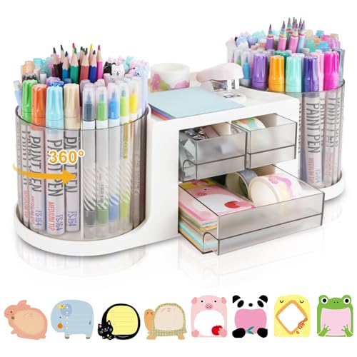 RETON Roterande skrivbordsarrangör med 2 pennhållare, multifunktionell pennkruka med 3 lådor, 10 fack pennhållare för skrivbord, kontor, skola, hem