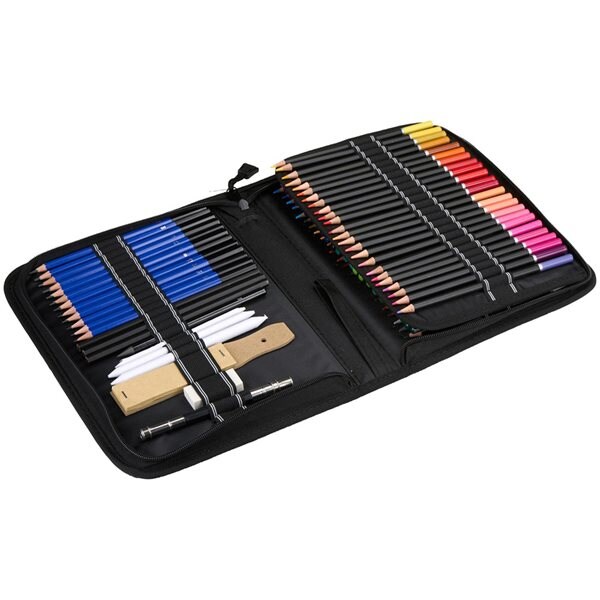 Panduro Hobby Ett glatt smiley-pennskrin fyllt färgpennor, tuschpennor och tillbehör