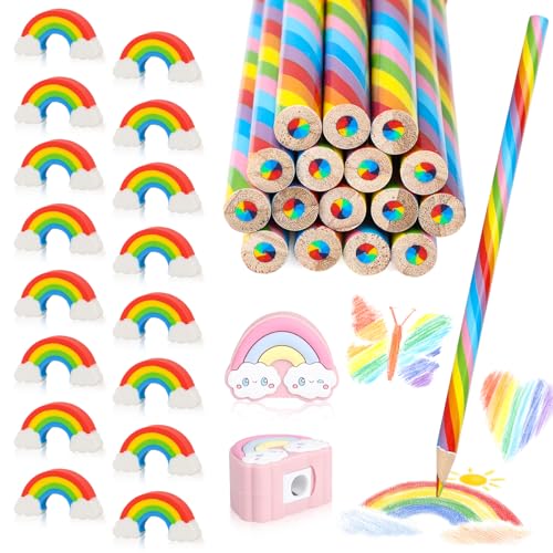 16 stycken regnbågspennor barnset, färgpennor inklusive 16 regnbågsradergummi och 2 pennvässare, 7 färger i 1 penna barn, regnbågspenna för målningsaktiviteter för barn och elever