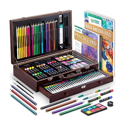 Norberg & Linden – XXL144 konstset i lyxig trälåda med låda inkluderar kritor, oljepasteller, akvarellfärger, färgpennor, pennvässare och skissblock för vuxna och barn