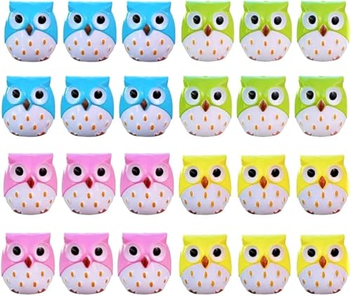 LATERN 24 st mini uggla pennvässare, 4 färger nyhet två hål pennvässare med behållare för barn studenter födelsedag presenter festpåse fyllning (4,5 x 4,3 cm)